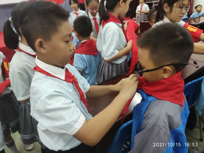 2021年10月15日下午,在下南小学的报告厅举行了隆重的一年级入队仪式。学生们在老师的带领下,早早地来到了会场,等他们人生中第一次意义重大的、激动人心的时刻——加入光荣的少先队组织。仪式中,歌声嘹亮,队旗、红领巾格外鲜艳,个个小脸上洋溢着开心灿烂的笑容。伴随着嘹亮的《少年先锋队队歌》,由老队员为新队员佩戴红领巾,互相庄重地敬了队礼。