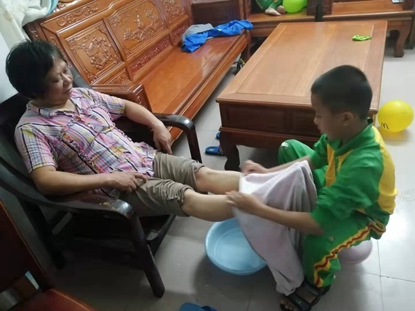 一到三年级的学生在家中对父母长辈说说藏在心中的温暖话语,为长辈做一些力所能及的家务。四到六年级的学生了解家中长辈的兴趣爱好与心愿期望,并且亲手为父母长辈做一道他们喜欢的菜。一道道精致的菜肴,一片片感恩敬老之意。虽然有的同学厨艺略显稚拙,但是其中包含着对家人浓浓的亲情爱意。
