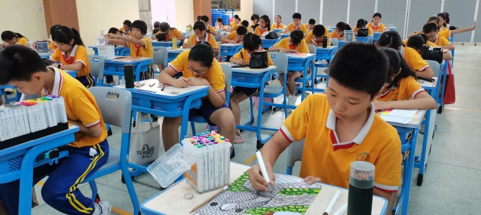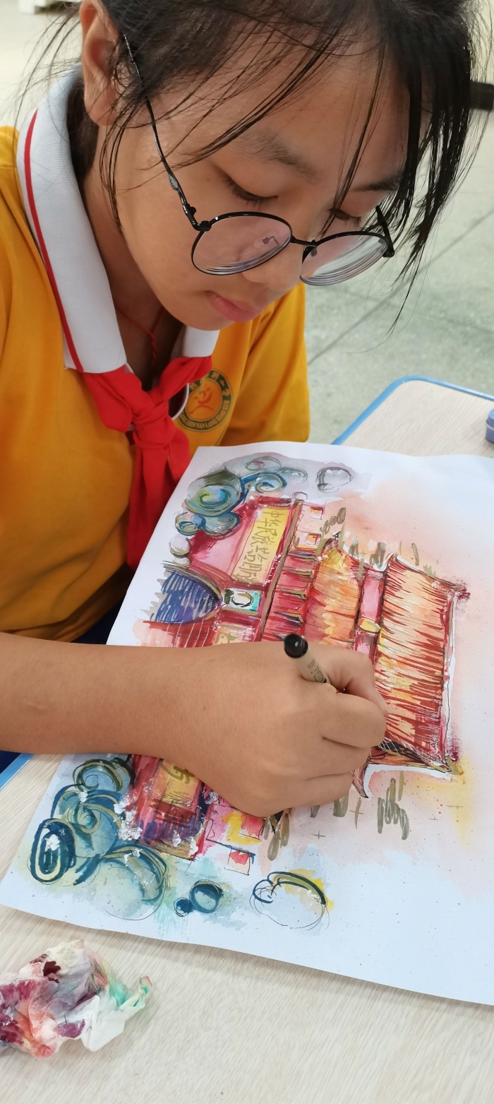本次以“喜迎国庆,祝福祖国”为主题的爱国主义绘画活动在南朗小学大礼堂进行现场书画创作。比赛现场,同学们作画方式多样:有的同学先用铅笔构图;有的同学直接用勾线笔造型;还有的同学用的是水彩的表现手法。同学们通过各种线条、色彩,仔细地描绘和表达他们看到的、感受到的、想到的心中最美的祖国,画中充满对祖国的大好河山的喜爱之情,流露出对祖国母亲深深的热爱。而在书法比赛现场中,同学们书写的是习近平总书记的重要讲话内容,字字都表达了同学们对中华人民共和国深深的爱意。