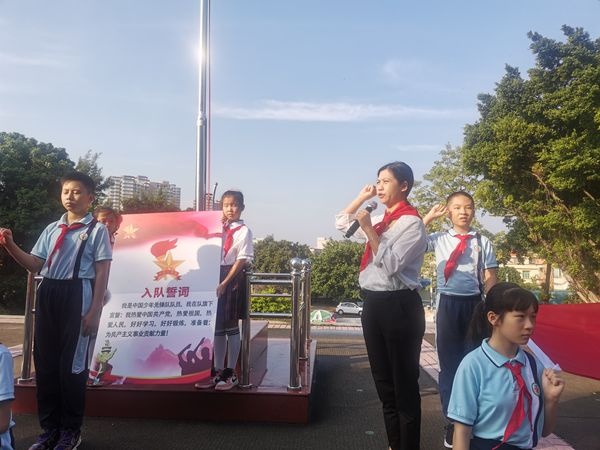 紧接着,少先队员们高举鲜艳的党旗和队旗,英姿飒爽地来到升旗礼台前,全体队员敬队礼,高唱少先队队歌,嘹亮的歌声立刻飘扬在校园上空,久久回荡。一曲结束,学校党员教师面向鲜红的党旗,在华校长的带领下紧握右拳,宣读誓词,整齐坚定的话语深深地震撼了全体师生。大队辅导员阮秀迎老师带领全体少先队员重温入队誓言,稚嫩真挚的童声里饱含着深深的报国情。
