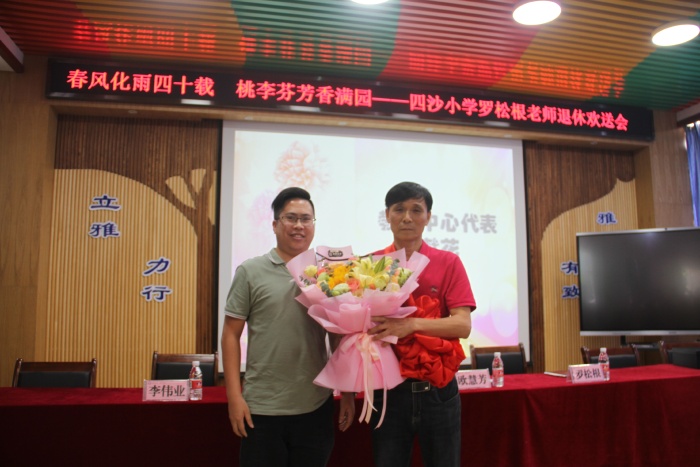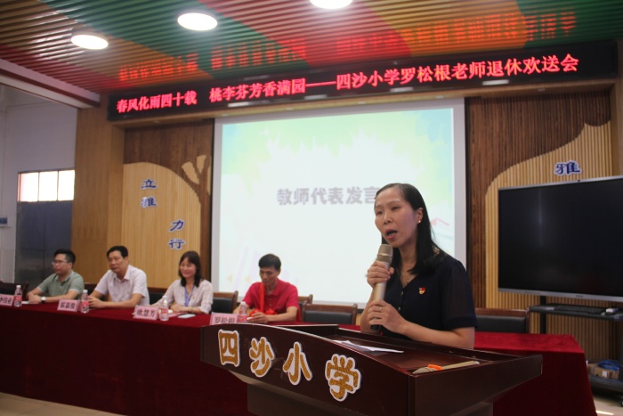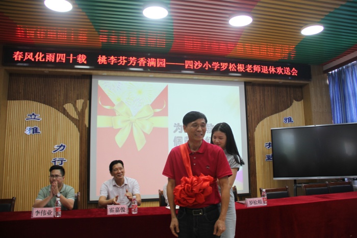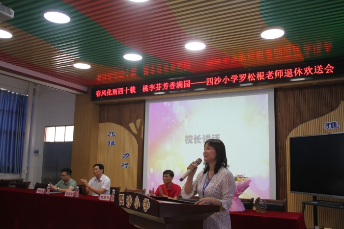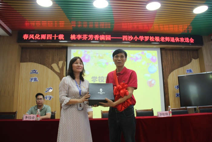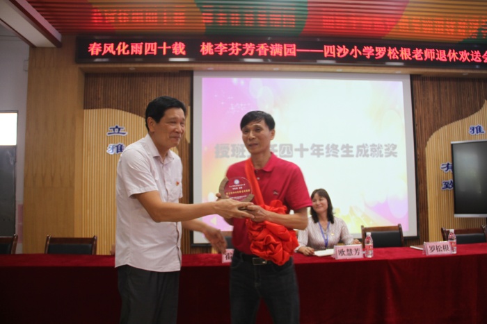 在热烈的掌声中,四沙小学校长欧慧芳代表学校给罗松老师赠送了纪念品,镇教育和体育事务中心代表李伟业为罗松根老师献上了鲜花,霍嘉俊主任授予罗松根老师 “班主任四十年终身成就奖”牌匾,感谢和肯定了罗松根老师为人民的教育事业作出的突出贡献。随后欧慧芳也代表学校作了热情洋溢的讲话,祝贺罗松根老师光荣退休,肯定了罗松根老师几十年如一日地在本职工作岗位上默默耕耘。无论是班主任工作还是教学工作,都力争做到最好。特别是担任学校象棋社团的辅导老师12年来,罗松根经常牺牲自己午睡时间,对学生进行象棋的辅导培训。所辅导学生参加镇的象棋比赛已荣获12连冠的好成绩,参加市的同类比赛也名列前茅。罗老师把人生最美好的青春年华献给了教育事业,是老师们学习的楷模。欧慧芳号召全体教师向罗松根老师学习,把罗松根老师无私奉献、积极进取的精神发扬光大。希望罗松根老师科学安排晚年生活的同时,常回家看看,幸福、健康、快乐过好每一天。