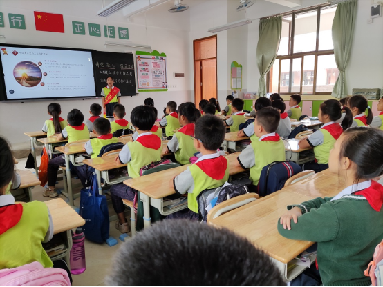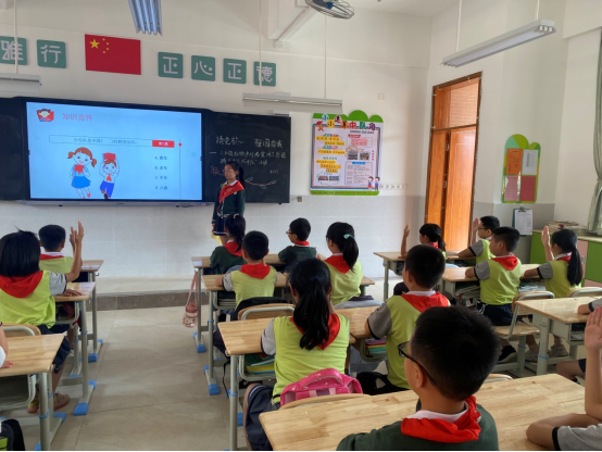 高年级宣讲轻骑兵走进三至六年级各中队,详细地为队员介绍了党的发展脉络、党的历史三大启示、党的三大历史贡献以及少先队的相关知识。宣讲接近尾声之际,高年级各中队纷纷开展了一场激烈的党史、队史知识竞赛,少先队员们积极踊跃发言,充分展示了红色江山后继有人的良好局面。