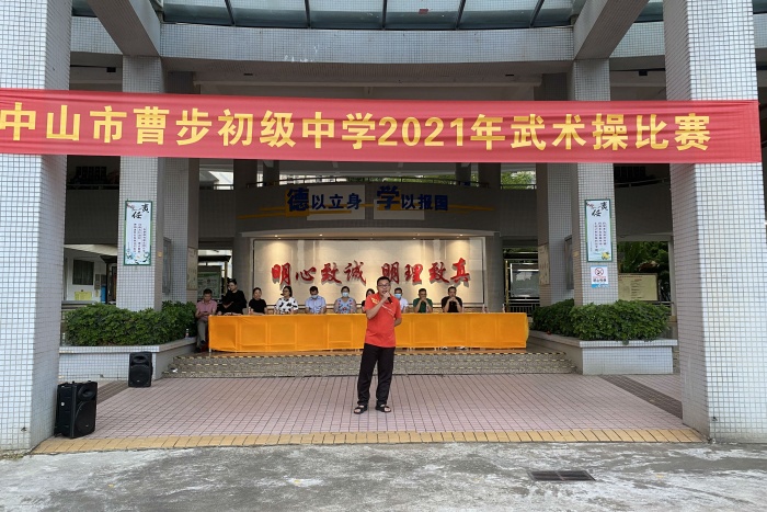 为了更好地促进曹步初级中学学生身体素质的提高,全面推行学校特色项目的发展,促进体艺2+2项目的建设,检测初一、初二学生课间操的学习成果,以“习惯养成”为原则,规范学校管理,加强班风班貌和精神文明建设,加强德育、智育、体育的发展和合作,全面增强班级凝聚力,促进学风、校风建设,使课间达到规范化、熟练化、美观化,2021年10月20日下午,曹步初级中学在中大堂前举行了初一、初二级课间操行为规范比赛暨武术操比赛,本次活动由体育老师贺坤主持,初一初二全体同学和部分家长参加了本次活动,学校领导和部分家委担任本次活动的评委。