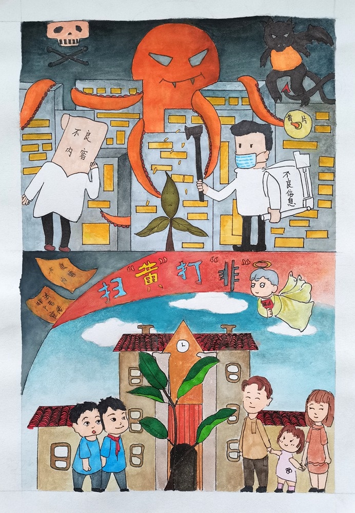 中共中央、国务院转发的“八五”普法规划和《关于加强社会主义法治文化建设的意见》要求,加强青少年法治教育,全面落实《青少年法治教育大纲》,教育引导青少年从小养成尊法守法习惯。东升高级中学为大力宣传“扫黄打非”知识,用好的艺术作品教育人、鼓舞人及感染人的功能,助推“扫黄打非”工作深入开展,2021年10月,学校德育处联合美术科组举办“扫黄打非”法制绘画大赛。