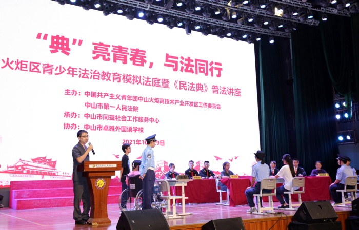 本次活动由中国共产主义共青团中山火炬高技术产业开发区工作委员会、中山市第一人民法院主办,中山市同益社会工作服务中心承办,中山市卓雅外国语学校协办。中山市火炬开发区法庭副庭长邓文辉法官、卓雅外校副校长李文等参加活动。