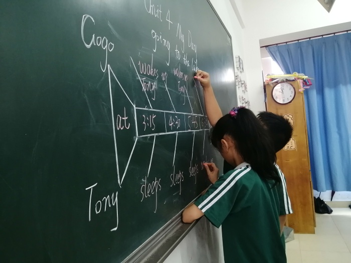 四年级的郭凤铃老师执教Unit4 My Day的故事课,图形组织者贯穿整节课的教学。郭老师以图促读,引导学生仔细观察图片,带着问题学习故事,激发阅读动机。同时,郭老师循循善诱,给学生示范如何一边阅读故事,一边制作鱼骨图。在支架的帮助下,学生自主阅读故事剩下的部分,小组合作完善鱼骨图。最后,郭老师引导学生借助鱼骨图复述故事,促进学生对文本的理解和掌握,进一步发展学生的语用能力。在学习能力培养的同时,郭老师也有意识地帮助形成学生的文化品格,渗透情感价值观:在合适的时间做合适的事情,凡事要做好详细的计划。