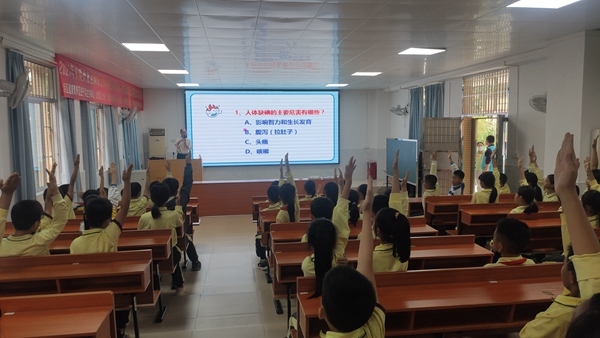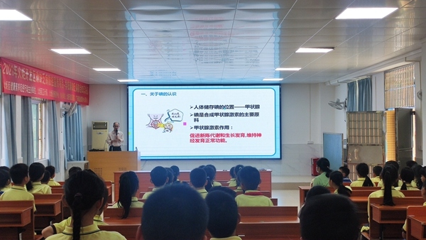 讲座开始,首先由中山火炬开发区医院邓成主任为学生开展“碘缺乏病知识讲座”,邓医生运用生动的语言,典型的案例,通过深入浅出的讲解和示范,分别从什么是碘,什么是碘缺乏病,碘缺乏病的危害及症状,如何正确食用碘、怎样预防碘缺乏病等多个方面向学生传授碘缺乏病的防控知识。学生们认真的听讲,积极发言,明白了日常生活中不正确食用碘盐的危害,以及平时在生活中如何正确补充“碘”。同学们为感谢邓医生的分享,现场响起一阵阵的掌声。
