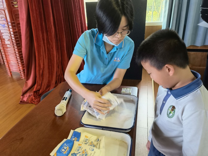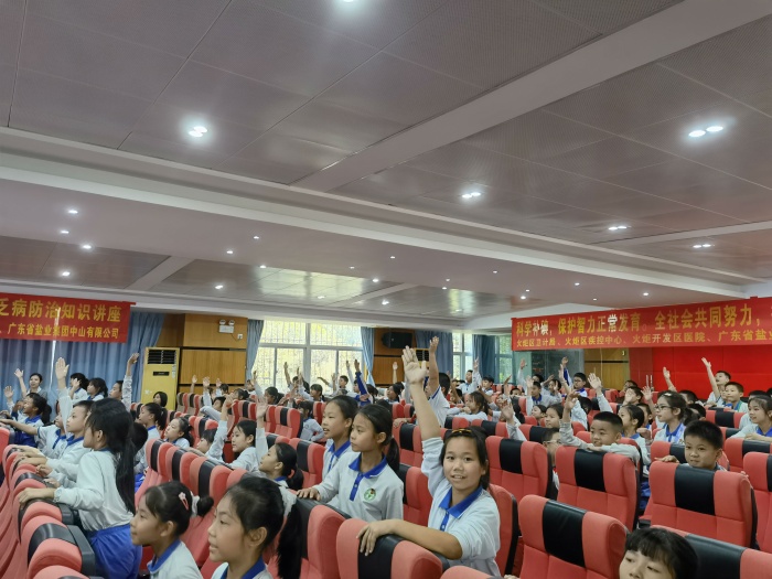 讲座中,火炬开发区医院儿童保健科邓成主任医师用风趣幽默的语言和生动形象的图片展示,讲解了碘的作用、缺碘的危害、怎样科学补碘等方面的科普知识,同学们知道了碘是人体不可缺少的一种营养素,缺碘不仅会导致“大脖子病”、体格发育障碍,更为严重的是影响脑发育,导致智力损伤。邓成主任医师还通过有奖竞猜的方式,吸引学生的兴趣,将活动推向了高潮。盐业公司邓奕主管更通过科学小实验,为同学们讲解了如何辨别真假食盐。学生认真聆听并积极参与实验,现场有序,气氛热烈。