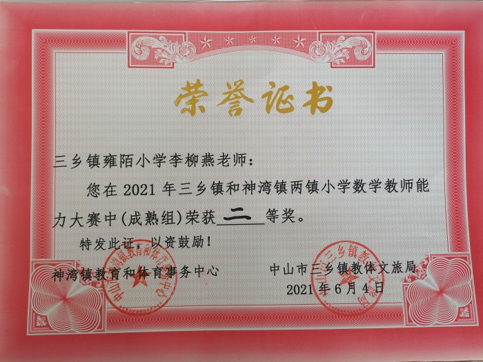 10月14日早上,在神湾中心小学举行了两镇小学数学教师素养大赛成熟组的决赛。李柳燕老师精心设计导入,善于发现并利用生活中的数学知识,层层递进,声情并茂,还融合了学科知识。最后以第三名的成绩荣获总决赛二等奖。