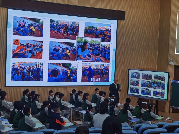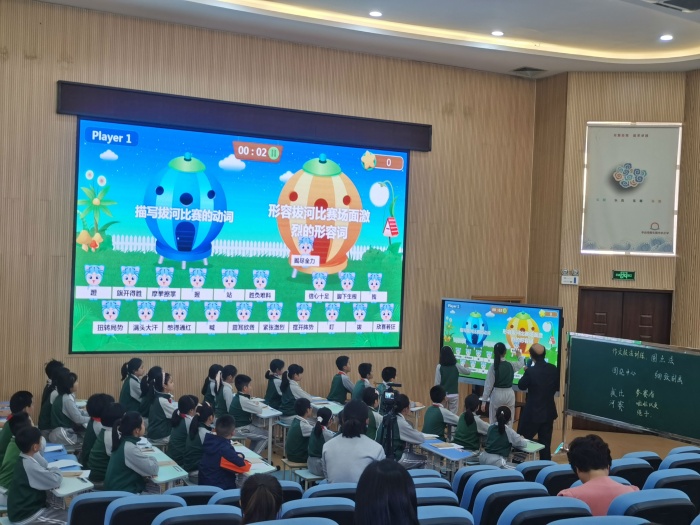 郭建平副校长执教的内容是《作文技法训练 圆点法——记一次拔河比赛》。上课伊始,郭副校长以微课引入,充分激发了学生的学习兴趣,微课中典型的案例分析,让学生马上理解了作文技法——“圆点法”。教学过程中,郭副校长还通过播放“南头镇中心小学校运会拔河比赛”视频,利用希沃白板5中的“放大镜”引导学生认真观察,让学生运用圆点法尝试选择材料,围绕“拔河比赛”中心点展开创作。