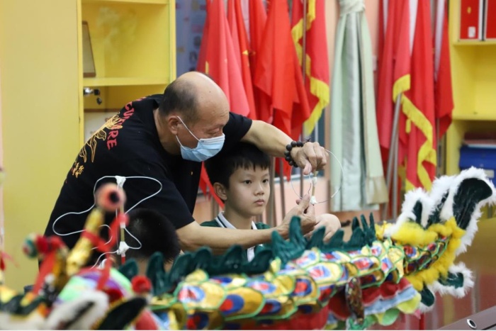 接着,水云轩小学党支部书记、校长林小舟就学校非物质文化遗产传承起湾金龙扎作技艺的情况进行总结,他称申报中山市非物质文化遗产传承基地结合“天时地利人和”,通过学校对起湾金龙扎作的普及推广让更多的孩子喜欢并传承是十分有意义的事情。水云轩小学黄文灿副校长就学校开展传承起湾金龙的相关活动进行介绍。