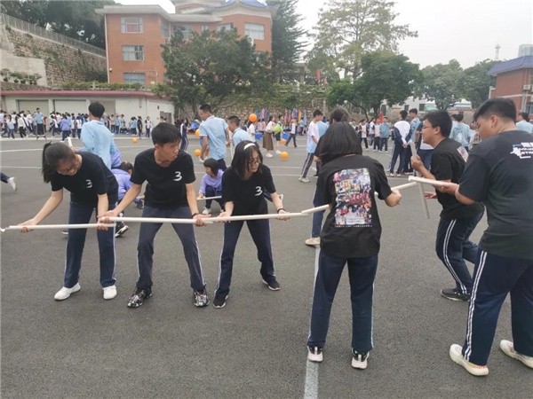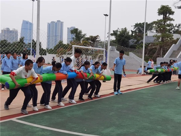 旗摇摇,鼓声声,挡不住的是青春活力;枪声响起,“预备起跑”,挡不住的是健儿们如火般的气势。本次运动会除50米、100米、立定跳远等竞技比赛外,还设置了众多趣味运动项目,如大拖鞋接力、踩高跷、气垫船竞速、巧接飞弹、蒙眼敲锣、引球过桥等,这些富有创意和趣味、需要凝心聚力、团队合作的比赛,让同学们放松心情、收获幸福快乐,实现“脑力体力皆锻炼,友谊竞技双丰收”。