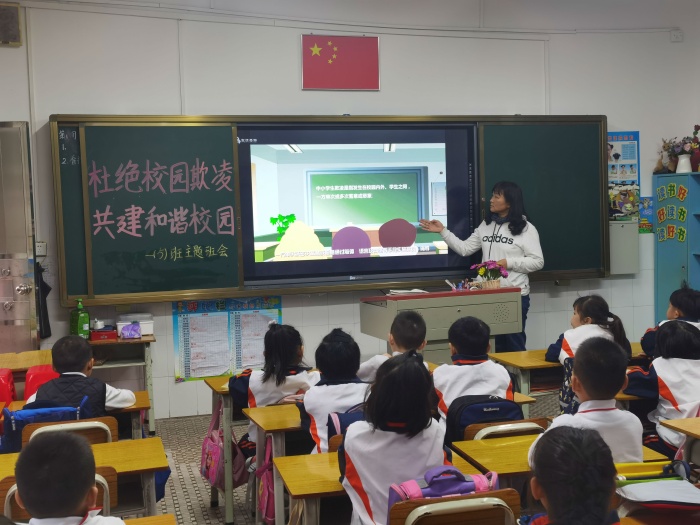 视频讲话中告诉学生校园欺凌是指同学间欺负弱小、言语羞辱及敲诈勒索甚至殴打的行为,主要表现形式有:索要钱物,不给就威逼利诱;以大欺小,以众欺寡;为了一点小事就大打出手,伤害他人身体,侮辱他人性格;同学们因“义气”之争,用暴力手段争短论强等。通过视频学习让学生了解什么是校园欺凌行为 ,并让他们从小学会保护自己。观看视频后,各班针对本班的实际情况进行强化教育。