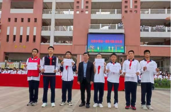 比赛结束后,吴超华主任宣布比赛结果,荣获一等奖的班级有三个,二等奖的班级有七个,三等奖的班级有五个,其中初一15班荣获特等奖。校领导为班级颁发荣誉奖状并合影留念。