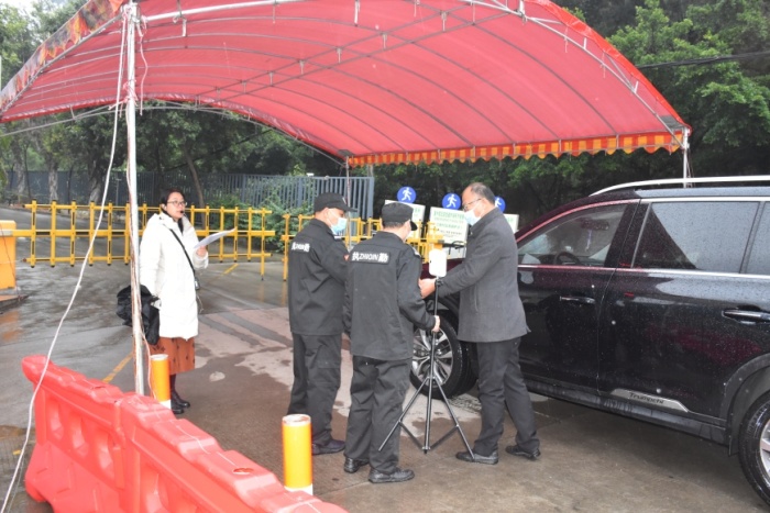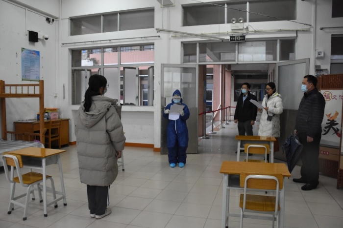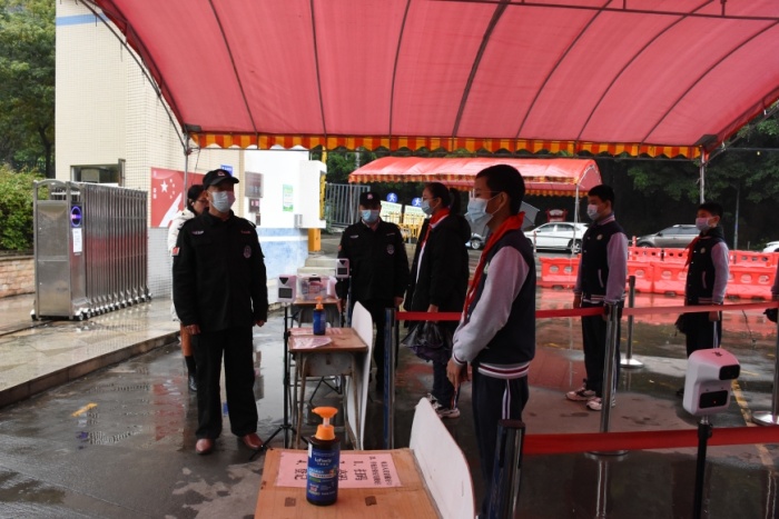 本次演练共预设了“返校入校管理”“学生就餐”“教室突发异常情况”“隔离室复查、转运及跟踪处置”“学校疫情防控领导小组启动应急预案”等场景,通过现场情景演示,结合旁白解说的方式,将校园疫情防控工作的每一个关键节点形象真实地演练出来。下午4点,2021年疫情防控应急演练正式开始,演练按照预设流程依次进行。其中,“返校入校管理”在学校正门口进行,“学生就餐”在学校饭堂进行,“教室突发异常情况”在教室进行,“隔离室复查、转运及跟踪处置”在校医室进行。