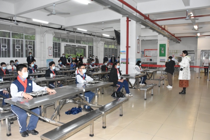 参加演练的学生首先在学校正门缓冲区排队等待返校健康筛查,负责测温的相关人员有序为每一位学生检测体温,对体温异常的学生及时安排复查。学生顺利入校后,接着进行了教师入校、外来人员入校两个情况的演练。随后,参加演练的全体人员来到学生饭堂进行学生就餐演练,从排队测温、洗手、取餐、用餐到用餐完毕,每一个环节都有序而规范。“教室突发异常情况”的演练中,参加演练的师生按照预设的流程完成了对突发情况的处理,从询问、判断、疏散隔离、医务人员介入、跟踪处置到应急预案启动,整个过程紧张而有序。