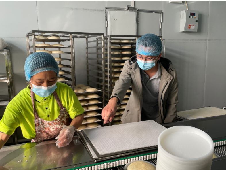 1月7日上午,位于黄圃镇鸿发西路的某食品有限公司生产车间内飘出阵阵葱油香气,两条糕点面包生产线正有序运转。公司创始人赵大慧如同往常一样早早来到车间,认真细致地检查生产线进度,亲自把关产品品质,不时叮嘱员工们要守护好食品安全,不可马虎。