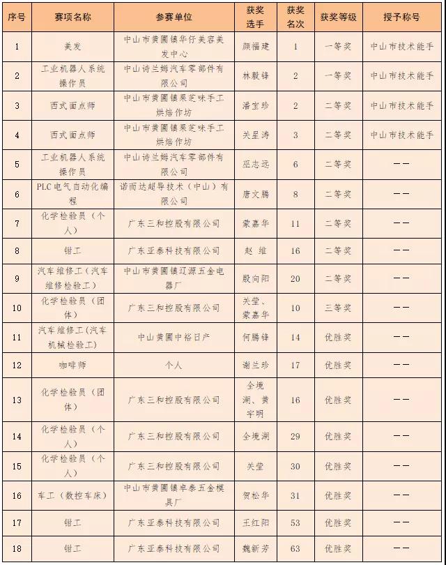 中山市第一届职业技能大赛获奖名单(黄圃镇)