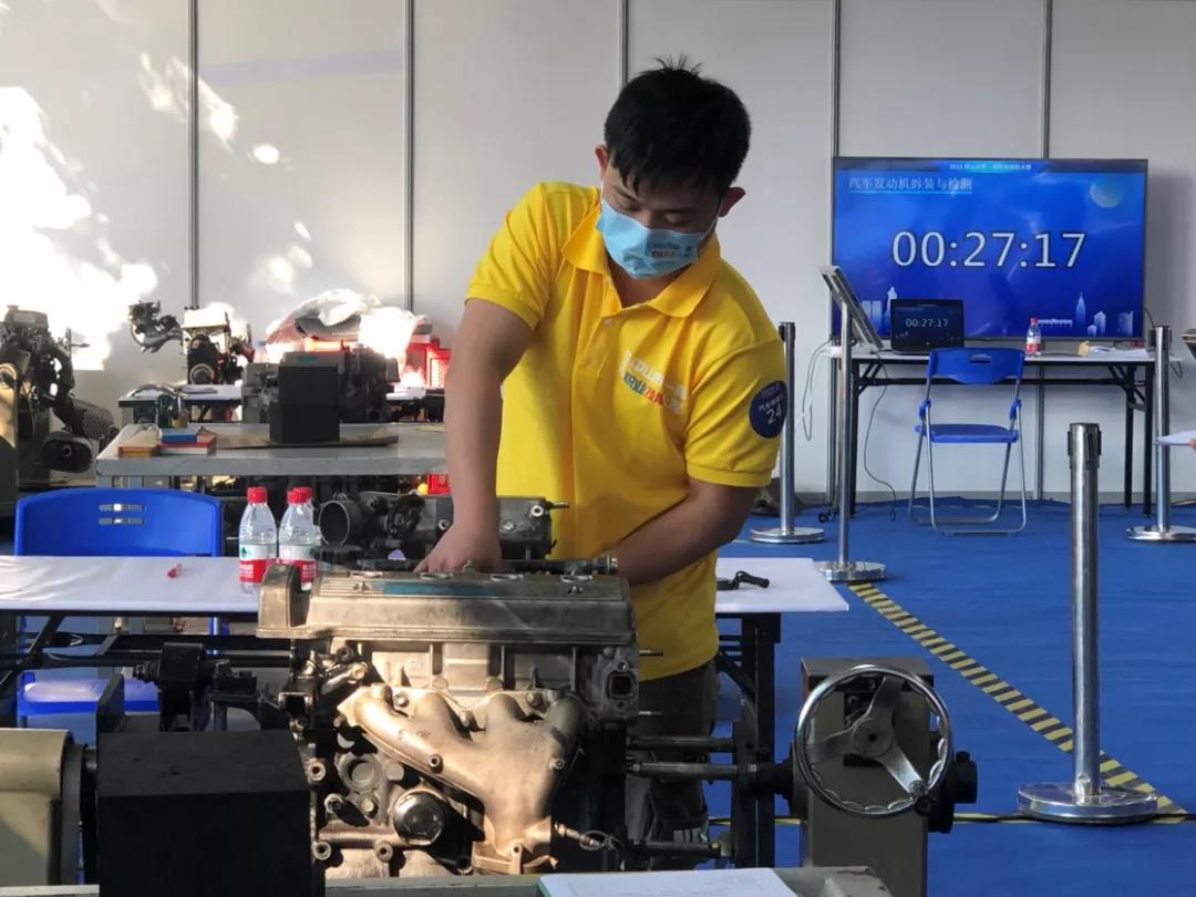 汽车维修比赛项目中,选手与时间赛跑,全神贯注投入比赛。