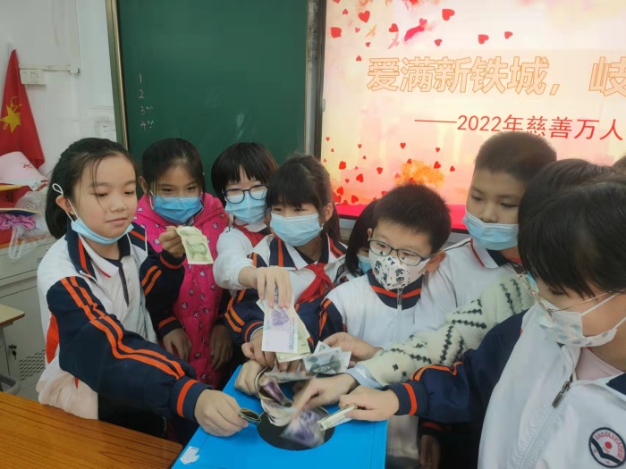 此次慈善万人行活动主题为“爱满新铁城,岐心再出发”。在郑结霞校长的引领下,学校的行政班子与老师们也齐心协力为慈善事业献出一己之力。这一小小举动,为学校的慈善万人行捐款活动开了好头。虽然秉承着自愿捐款,以力所能及之力奉献爱的原则向孩子们发出倡议,但正如本次活动主题那般,整个爱心捐款活动收获了孩子们满满的爱心。此次活动以班级为单位进行,利用大课间时间,由班主任主持此次的活动。活动进行期间,看着孩子们将提前准备好的零钱迫不及待地平铺在课桌上,满脸笑颜地等待着自己走上捐款箱的那一刻。有的经过深思熟虑掏出自己珍藏多时的压岁钱献上爱心;有的则是和父母商量着从买零食、玩具的零花钱中拿出一部分出一臂之力;而有的孩子更是和父母一起为爱助航。看着那一张张被他们拽得有点皱巴巴的零钱,再看看他们脸上那幸福与满足的笑脸,由衷为每个孩子心中的那份天真且简单的爱心而感动。