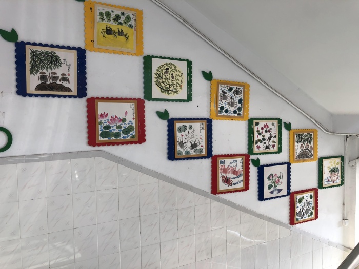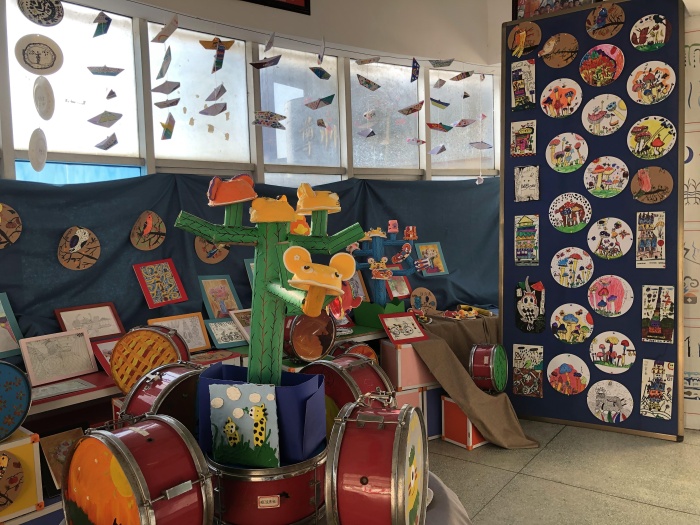 除此之外,安阜小学本次元旦画展的一大亮点是传达了环保的理念:学校美术兴趣小组的同学们在老师的带领下把鼓号队置换下来的旧小鼓变成了画布,创作了一系列鼓面装饰画。为画展增添了活泼的色彩。
