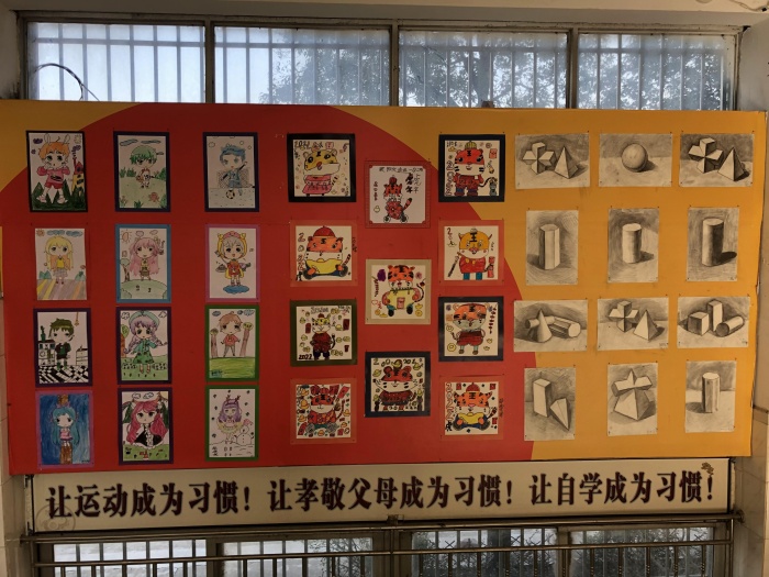 此次书画展以“绘画展风采,墨香庆元旦”为主题。在全校师生的精心准备下,共收到绘画、书法、手工等各类作品近100件,各个兴趣小组的学生以饱满的热情,创作出了自己最得意的作品。本次书画展主要分为三大板块:绘画作品、书法作品以及手工立体构成作品和轻黏土作品。展出的作品形式多样,可谓亮点纷呈。