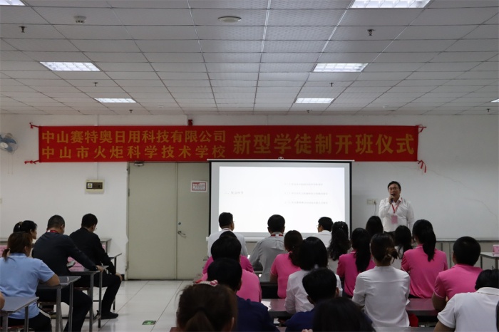 2023年3月15日,中山市火炬科学技术学校与中山赛特奥日用科技有限公司新型学徒制开班仪式在赛特奥公司举行。火炬科技学校校长陈建国、副校长王剑勤、校企合作处副主任邓明、中山市人力资源和社会保障局小榄分局朱嘉敏副局长、赛特奥公司董事颜发广、高级经理邹秋娟,以及相关老师、公司员工参加开班仪式。开班仪式由赛特奥公司人力资源部林创英主持。