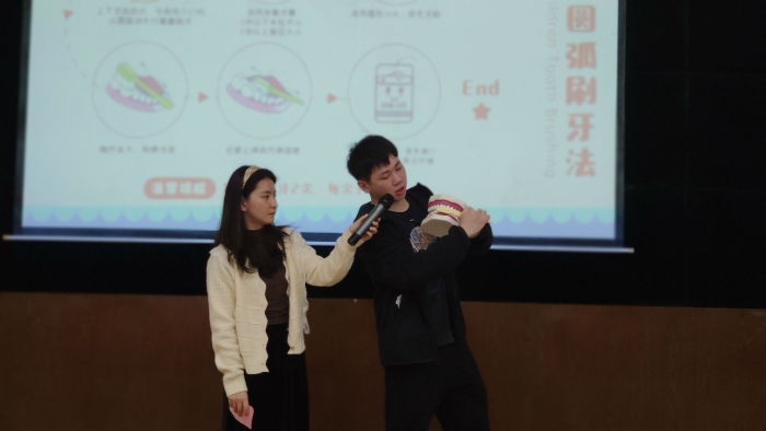 活动伊始,新联小学校长吴肇葵感谢板芙镇相关部门为学校师生带来知识讲座。他结合自身成长经历告诉学生口腔保护以及毒品预防的重要性,提醒学生在讲座中要认真倾听。板芙医院口腔科医生罗睿用通俗易懂的语言为同学们科普了丰富有趣的口腔健康知识。他从口腔存在的普遍问题,窝沟龋的发展过程及口腔保健等多方面详细阐述了口腔保健的重要性,并强调生活中要养成早晚刷牙、饭后漱口等良好的好习惯。然后,他还通过图文和实物模型结合的形式为孩子演示正确的刷牙方式,同学们听得津津有味,跟着罗睿医生的步骤逐步学习正确、科学的刷牙方式。