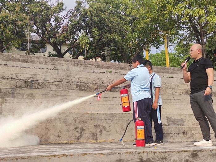 消防安全逃生后,全校师生集结于国旗下。李耀康老师对本次演练活动作出总结,对同学们能有序、安静、快速撤离逃生给予赞扬,并再次向同学们讲解消防安全知识,希望全体同学牢记安全知识,在遇到突发紧急情况时能冷静安全地逃生。黄孔佳主任向全校师生讲解灭火器的使用方法和注意事项,并现场演示灭火器的正确使用。通过本次观摩,全体学生掌握了灭火器的使用方法和技巧,在遇到突发的一般火情时能够做到正确冷静处理。