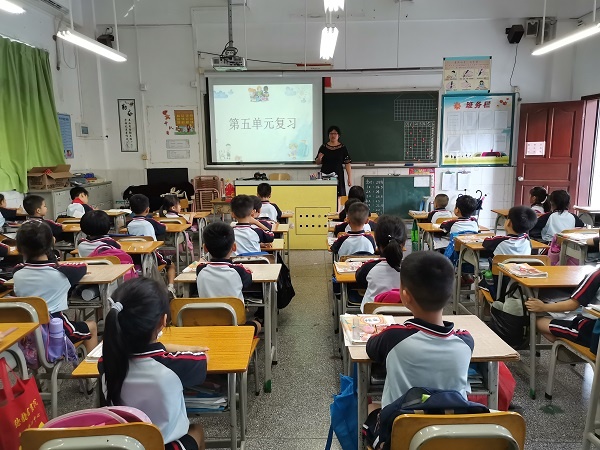 庄老师执教的这节课的教学重点聚焦在一年级下册第五单元的复习。上课伊始,庄老师带着同学们纵览第五单元的所有课文,再分门别类从第五单元的一类字、二类字、重点词语、重点句子、多音字、同音字、形近字、日积月累中的歇后语带着同学们一起复习巩固,最后通过10分钟的当堂小测验,趁热打铁,及时巩固学生的第五单元复习成果。