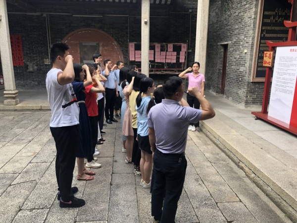 参观完展板后,全体党员在宗祠大厅门口集合,骄傲地挺起胸、握紧拳,庄严宣誓。“时刻准备着!”铿锵恢弘的誓词,强烈震撼着每一位党员,指引党员时刻遵守党的章程,践行党的宗旨,做一名合格的共产党员。