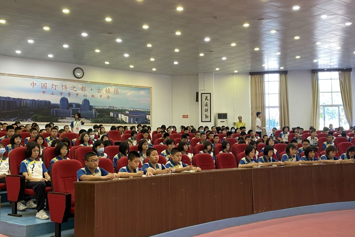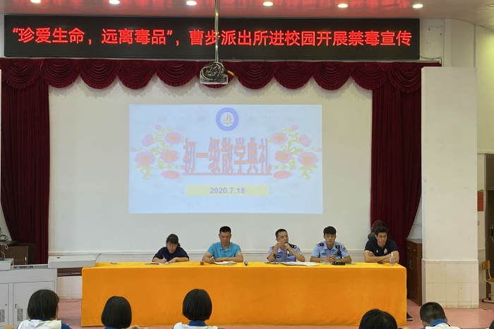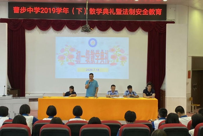 情溢校园,欢遍满园。忙碌而充实的一个学期结束了,2020年7月18日上午8:30,中山市曹步初级中学2019-2020学年(下)散学典礼暨法制安全教育在学校报告厅隆重举行,参加会议的有吴文杰副校长、学校法制副校长朱扬、初一级长马丽老师、初一级各班班主任及全体初一级同学们。
