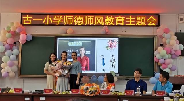 会议的第二议程为退休教师欢送会。首先,唐慧玉校长代表全体教职员工祝贺两位老师光荣退休并为她们送上纪念品。紧接着各科组代表分别为三位老师献花,献上了最真挚的祝福与礼物。三位老师的徒弟也通过播放图片的形式,回顾了三位老师在古一小学度过的时光,并对三位老师为学校建设所做的贡献表示真挚的感谢。随后,冯润爱老师向与会教师分享了36年兢兢业业献身教育的工作历程。而苏炎松老师朴素的发言,让所有年轻老师更是深深感受到了一位退休教师对工作、对艺术追求的赤子之心,也表达了他对学校未来发展的美好憧憬和祝福。唐佩华老师提及自己几十年的工作生涯感慨万千,有对教育事业的深厚情感,也有对学校以及同事们的感谢和眷恋之情。时间本没有特别意义,但长久沉淀的教学日常,让教师的青葱年华酿成了满园的桃李芬芳。最后杨红卫校长用了十个字进行总结:感谢、感动、感激、期待与祝福,他对冯老师、苏老师、唐老师仍为了学校教育教学工作的顺利进行,继续坚守在一线教学岗位,站好最后一班岗的这种奉献精神表示真诚地感激和深深的敬意!学校的每一步发展、每一点成绩都离不开他们曾经的汗水和付出,希望全体教师能够把这种难得的爱岗敬业与无私奉献的精神在古一小学继续传承下去。