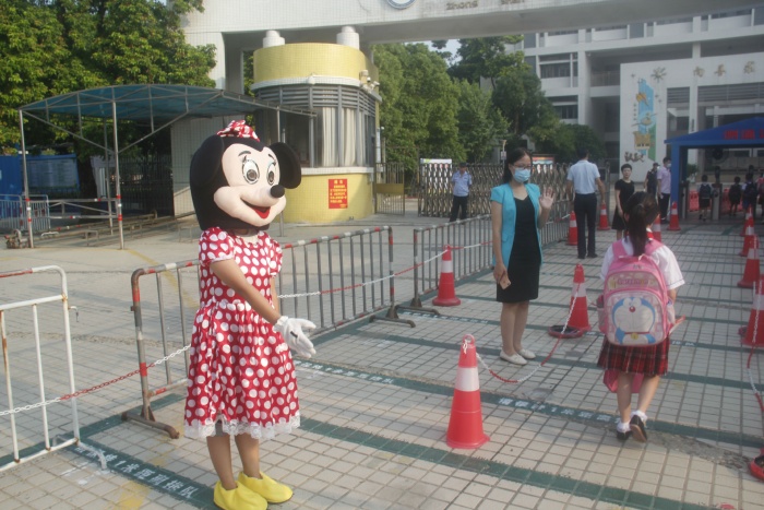 对于一年级的萌新们来说,第一次走进小学校园,很多事都是未知的。因此,镇南小学贴心的安排了部分老师,专门负责带领宝贝们回到自己的班级。同时,校家委会成员也在校门口帮忙指引前来报道的新生家长。为了让小朋友感受到如家一般的温暖,家委会志愿者还扮成了玩具人偶,与报道的小朋友一一打招呼。