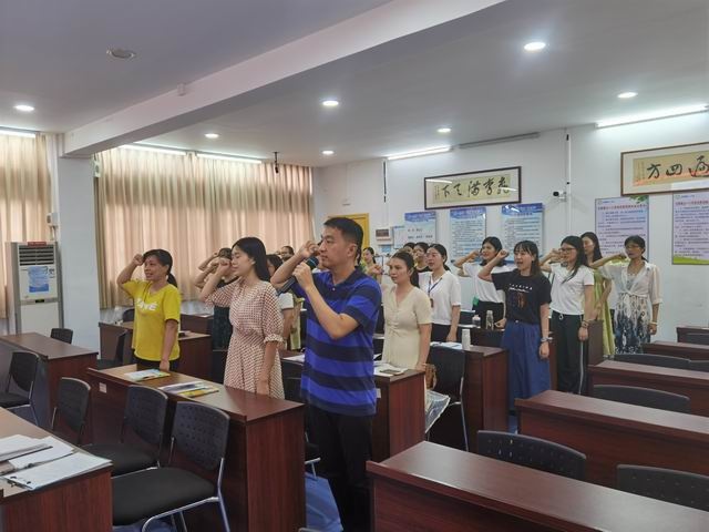 在简单介绍德育小组成员以及信息小组成员后,全体班主任进行了庄重的宣誓仪式,使每一位班主任不忘走上教坛的初心,热爱教育事业,师德高尚,乐于奉献,爱岗敬业、合作包容,无违背师德师风言行,更重要的是为了孩子一切,为了孩子的一切而奋斗终身!