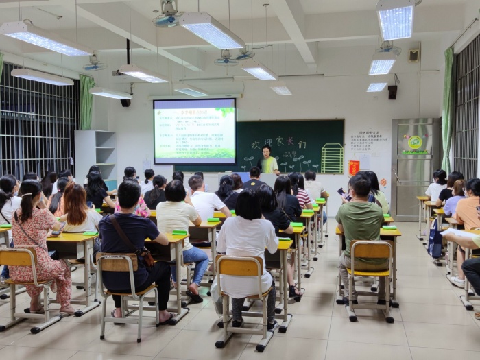 主会场的会议内容结束后,由各班级的班主任带回到自己的班级,班主任和科任老师对班级的常规以及学科的教学特点、学习方法等进行讲解。家长们深受启发,纷纷做好记录和拍照。(插入图片7~14)