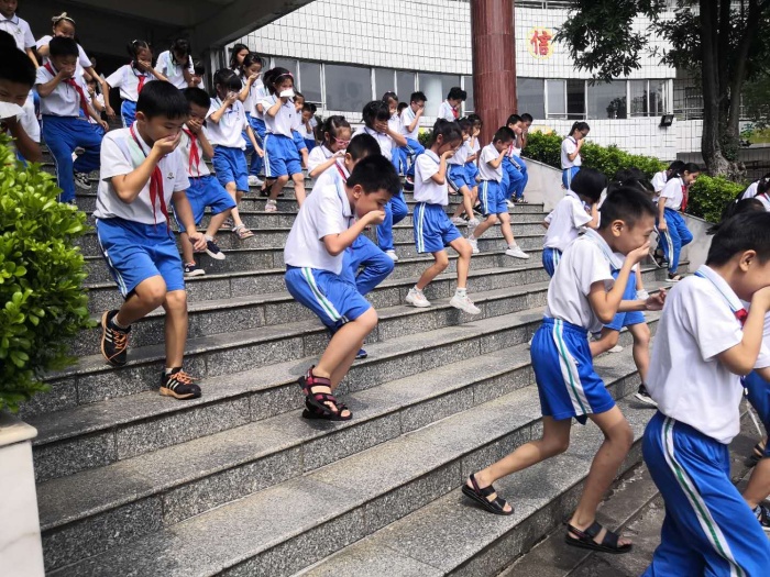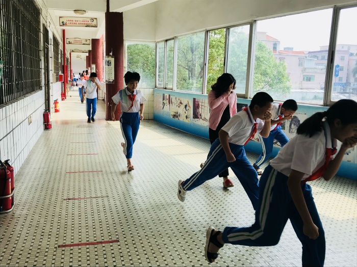 为了实施好这次演练,学校制定了详细的消防疏散演练方案,并对各班逃离的路线及每位配班老师的职责、每层楼梯口的值班老师等内容都作了明确的规定。演练开始前,班主任给学生介绍了逃生的注意事项和方法。下午2点,校园中消防警报拉响,学校各班主任老师在班级迅速组织学生疏散,各楼层护导老师们也在第一时间在自己当时所在楼层拐角处配合疏散学生。各班学生在老师们的指挥下,按照指定路线,弯着腰,用手帕、毛巾等捂住口鼻迅速有序地撤离到学校操场的安全地带。随即各班清点人数,并向演练指挥报告。本次消防演练仅用时2分45秒就全部安全疏散,整个演练活动快速、安全、有序。