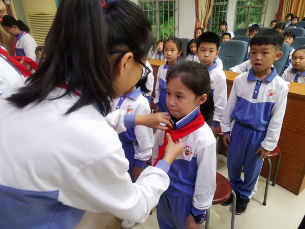 仪式在嘹亮的队歌中拉开序幕, 同学们在大队辅导员钟捷婷老师的指挥下高唱队歌,“星空体育是共产主义接班人,继承革命前辈的光荣传统……”嘹亮的歌声表达了同学们对少先队组织的向往与热爱。当老队员亲手把红领巾戴在31名新队员的胸前,新队员的那份激动与骄傲无以言表。
