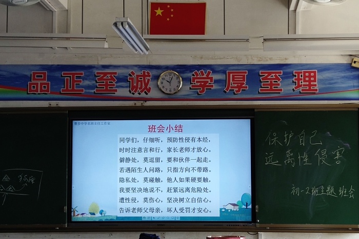 为了防止恶性事件的发生,教育学生保护自己,2020年10月12日上午第二节曹步中学初一(2)班进行了以“保护自己,远离性侵害”为主题的班会课,初一(2)班班主任李佳宁老师及全班39名学生参与了这次班会课。
