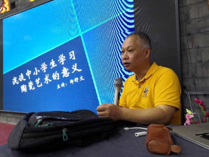 24日早上,活动邀请了国家级技能大师、全国拉坯冠军占绍林老师为大家演示拉坯。从小杯、碗碟、大的器皿,再到拉坯联想创作,他让泥巴在掌指间轻松自如随心变化着,充分展示出占老师非常强的拉坯水平,让大家惊叹不已!下午,广东省工艺美术大师郑舒文老师为大家主讲了《浅谈中小学生学习陶艺的意义》,演讲把这次学习活动推上了高潮。通过演讲,教师们了解了陶瓷与历史文化、科技、美术以及生活的联系。