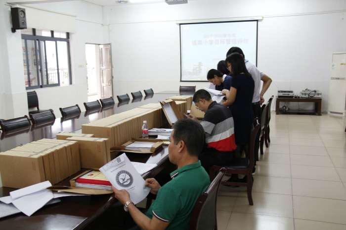 最后,评估组成员查阅学校各项常规资料。他们根据检查评估的内容,利用《镇南小学推进素质教育目标管理评估资料索引》,对镇南小学党建工作、队伍建设、规范办学、校园安全、德育常规、教学常规、后勤保障、综合素养、教学质量、特色建设等方面的资料进行了认真查阅,仔细量化,合理评分,及时反馈,并给学校提出一些中肯的改进建议。
