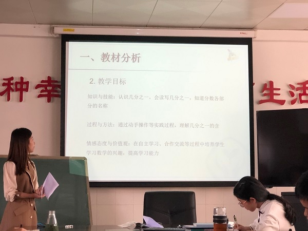 李老师拿到的模拟说课内容是《几分之一》,时间虽然紧急,但是李老师依旧准备得很扎实。从教材分析、教学目标、教学重难点、学情分析到教法学法的分析,李老师都把握得十分到位,再说到教学过程时候,李老师更是从容不迫,处理灵活。接着由参会的老师们一起提问,在提问的过程中再次梳理了本节课的内容,在集体起研讨中发现问题、解决问题。
