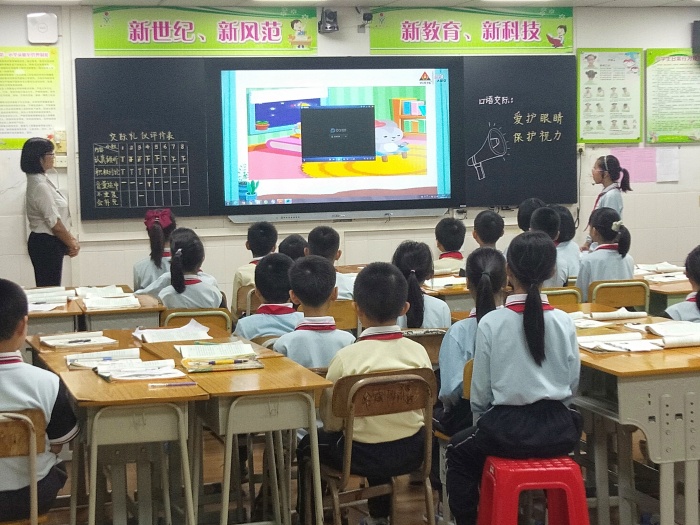 在课堂上,陈老师教态自然大方,通过目标导向,让学生明确学习目标。接着通过视频导入、课前调查分析、小组合作讨论,小组上台展示,课堂知识拓展等环节教学。陈老师的课堂设计有梯度,由易到难,使学生更好地接受知识。通过交际训练,学生能说出影响视力的原因、保护视力的措施,突出了口语交际训练的本色。课堂中班长担任小老师,老师从旁指导,师生与生生间精彩的互动交流将课堂氛围推向高潮。