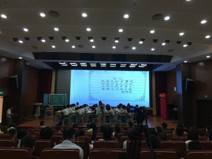 当天早上共有两节课例,分别是林燕妮老师的语文课例《示儿》与罗燕红老师的书法课例《木字旁》。林老师以“心心念念的事情”为话题导入,引导学生在古诗学习中深入感悟诗人的情感,并结合语文园地当中的“书写提示”训练,在语文课中融合了硬笔书法的书写指导,给人耳目一新的感觉。罗老师则是完整地示范了一节毛笔书法课的教学过程。罗老师专业知识丰富,用读帖的方式引导学生观察字形和搭配变化,循循善诱,引导学生写好“相、杖、柱”三个毛笔字。