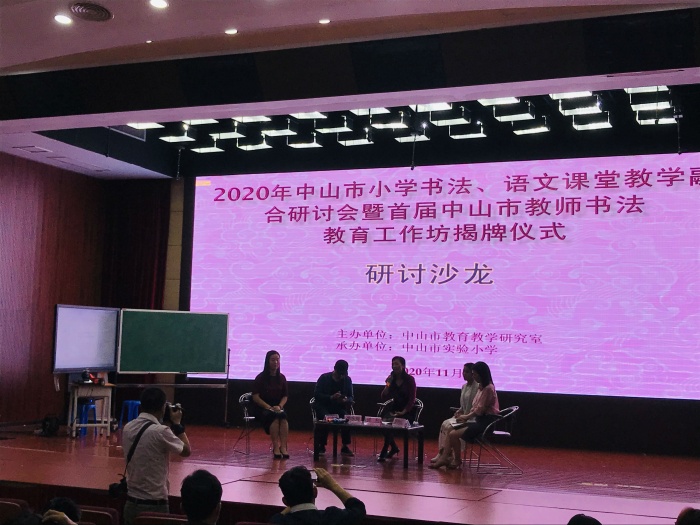 在研讨沙龙环节,何利老师、何宝华老师、单永辉老师以及两位上课老师进行了激烈的交流与讨论。围绕“语文课如何融合书法教学”“书法课该怎么上”的主题,大家各抒己见,碰撞出思维的火花,给在场的老师以深思、以提示。最后,在教研室梁雪菊老师的主持下,首届中山市教师书法教育工作坊揭牌仪式顺利完成。梁老师还为大家做了主题为“《中小学书法教育指导纲要》的实施与中山市书法教育教学发展构想”的讲座。