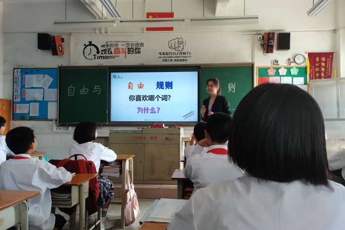 首先,班主任毛茜老师问了同学们一个问题:你们是喜欢自由多一点还是规则多一点啊?同学们纷纷举手回答问题,有的答自由,因为快乐幸福,开心。有的答规则,因为没有规矩不成方圆。