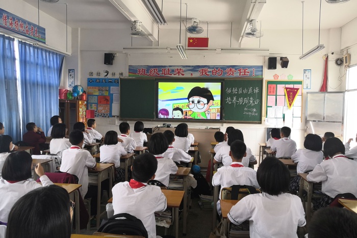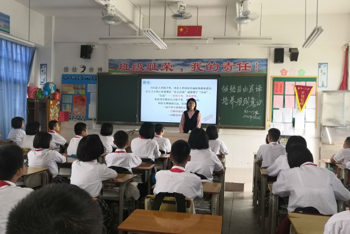 首先,一(7)班的班主任朱嘉琪老师让同学们思考一个问题:自由和规则,同学们选哪一个?大部分同学都选择了自由。接着,老师又问同学们,如果这个世界有自由但没有规则的话,会变成什么样呢?带着这两个问题,这节主题班会课开始了。