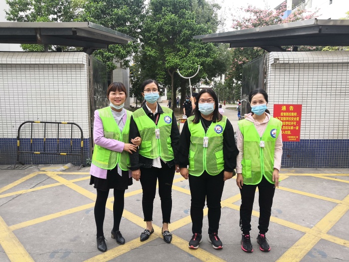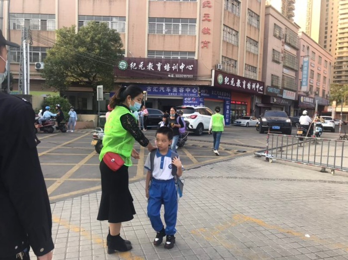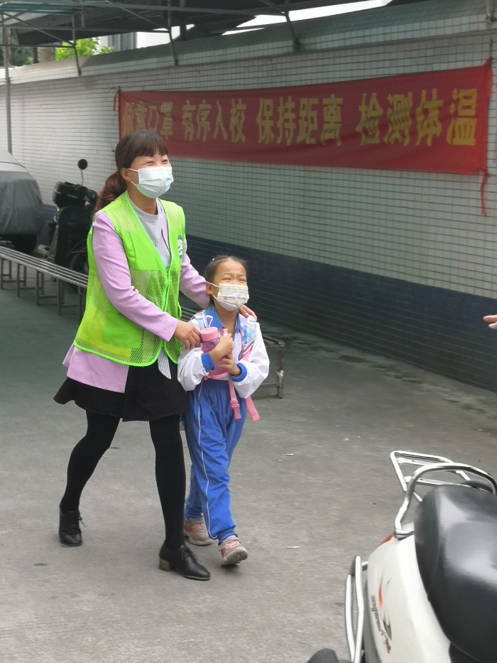 在学生人流量最大的时候,守在东门两侧的家长还会引导学生们排好队,有序地测量体温,然后进入校园。当看到孩子的服装不整齐时,会及时地提醒孩子整理好自己的仪容仪表,提醒没有佩戴红领巾的孩子及时佩戴好红领巾。