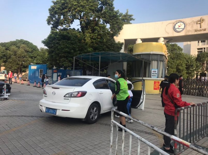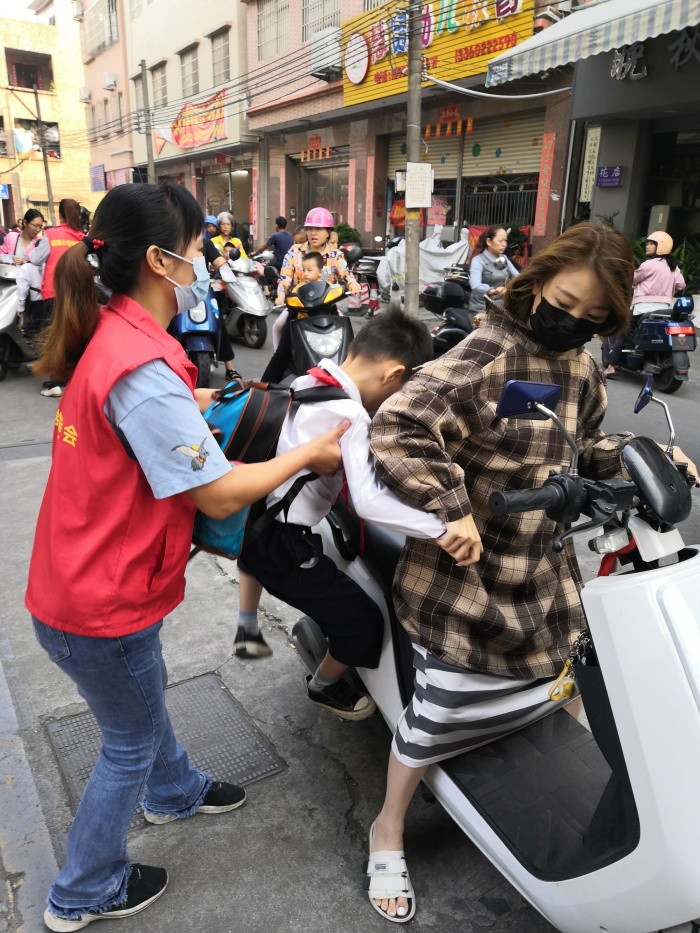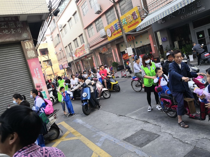 7:40——7:50分是学生流量最大的时候,摩托车、小汽车接踵而来,也是交通最堵塞的时候。为了能更快地疏导交通,义工队的家长们有条不紊地忙碌着:他们从摩托车上扶下个子小的孩子,帮助他们背上沉重的书包;教育孩子跟爸爸妈妈说一声再见;拉一下车门,让孩子快速的从车上下来,轻轻一关车门,车即离开......