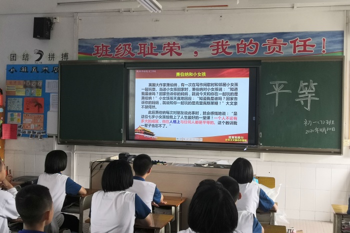 第四部分:说践行。朱嘉琪老师让同学们针对自己身边(不)平等的事情说出自己的感受和看法。最后,朱嘉琪老师告诉同学们:人生而平等,大家都在初一(7)班的教室里学习,每个人都是平等的,要互相理解、互相包容,然后共同进步,真正的成为相亲相爱的一家人。